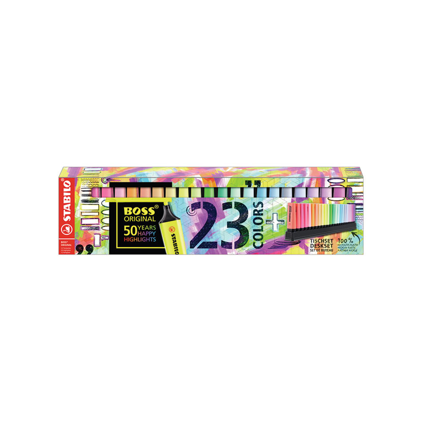 Představujeme Vám krásnou sadu 23 kusů zvýrazňovačů Boss Original značky STABILO, která byla vydána jako limitovaná edice k výročí 50. narozenin společnosti STABILO!